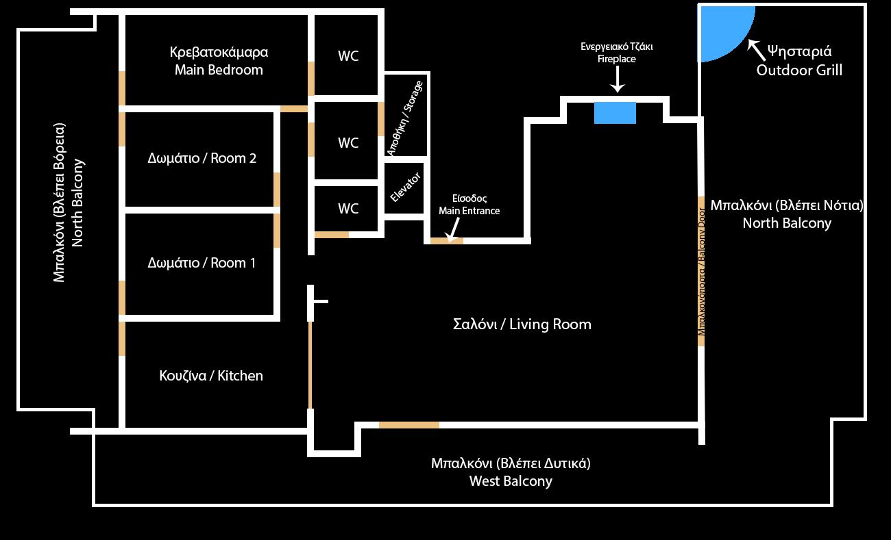 Διαθέτει δύο εισόδους, η βορεινή οδηγεί απευθείας στο βουνό που προσφέρει προστασία από τον κρύο βοριά. Το ήμερο και προσβάσιμο πευκοδάσος είνα ιδανικό για περιπάτους καθ’ όλη τη διάρκεια του χρόνου. Η κύρια είσοδος του διαμερίσματος βρίσκεται προς το νότο και είναι δίπλα στο ιδιωτικό πάρκινγκ, διευκολύνοντας την καθημερινή σας ζωή.